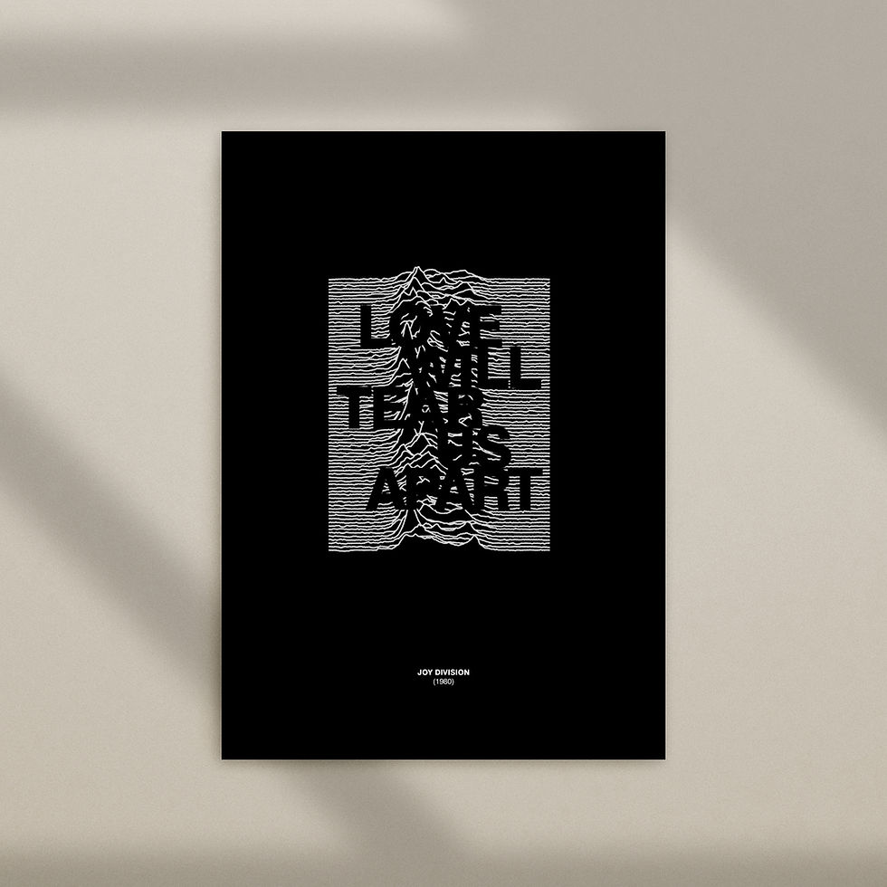 A series of designs featuring lyrics of songs by iconic Manchester 'alternative' bands, each rendered in appropriate typographic styles.